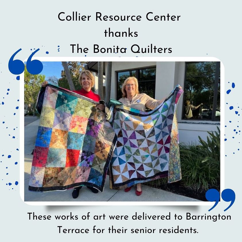 Donated quilts for Seniors The Collier Resource Center thanks the Bonita Quilters for the works of art that went to Barrington Terrace for the senior residents there.